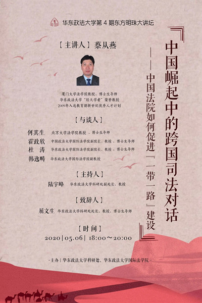 華東政法大學第4期“東方明珠大講壇”有幸邀請到廈門大學法學院教授、博士生導師,華東政法大學“經天學者”榮譽教授蔡從燕在線主講《中國崛起中的跨國司法對話——中國法院如何促進“一帶一路”建設》。蔡從燕教授主要從事國際法律理論、國際投資法、對外關系法以及中國國際法政策與實踐的研究,已在《法學研究》、《中國法學》、American Journal of International Law, European Journal of International Law, Journal of International Economic Law 等國內外學術刊物發表一系列中英文學術論文,在牛津大學出版社出版The Rise of China and International Law: Taking Chinese Exceptionalism Seriously (2019)。同時是牛津大學出版社出版的The Oxford Handbook of Comparative Foreign Relations Law(2019)和The Oxford Handbook of Global Security and Law 的作者。他也是馬克斯普朗克國際法與比較法研究所主持、劍橋大學出版社出版的“馬克斯普朗克戰爭與和平法三人談”(Max Planck Trialogues on the Law of Peace and War)系列著作第五本(進行中)的作者。他曾經擔任紐約大學法學院Fulbright Scholar暨Global Research Fellow、洪堡大學—柏林自由大學—波茨坦大學“國際法治興衰?”(International Rule of Law: Fall or Rise?)項目Senior Fellow、哥倫比亞大學法學院Visiting Professor以及神戶大學法學部Visiting Professor等。