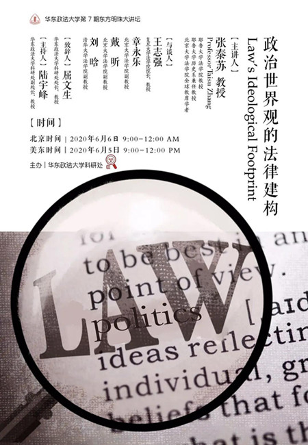 華東政法大學第7期“東方明珠大講壇”有幸邀請到耶魯大學法學院教授,耶魯大學歷史系兼任教授,北京大學法學院全球教席學者張泰蘇在線主講《政治世界觀的法律建構》。張泰蘇教授先后在耶魯大學獲得學士學位、法律博士、歷史學博士學位,曾任教于杜克大學法學院與布朗大學歷史系,曾任中國法律與歷史國際學會主席,主要研究方向為比較法律與經濟史、產權理論與中國司法系統。張教授的代表性學術成果有專著《儒家的法律與經濟:前工業化時期中英家族與產權制度比較》(The Laws and Economics of Confucianism: Kinship and Property in Pre-Industrial China and England,劍橋大學出版社2017年出版),該書榮獲美國社會科學歷史學會頒發的會長獎以及麥克米倫國際與地區研究中心頒發的蓋迪斯-史密斯圖書獎。張泰蘇教授即將完成專著《清代財政國家的意識形態基礎》。