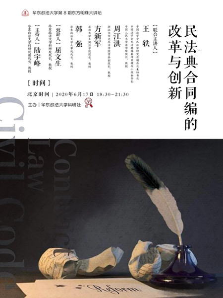 值此《民法典》頒布的歷史時刻,華東政法大學第8期“東方明珠大講壇”特別邀請中國法學會民法學研究會副會長兼秘書長、中國法學會民法典編纂項目領導小組秘書長、中國人民大學法學院院長王軼教授,浙江大學光華法學院常務副院長周江洪教授,蘇州大學王健法學院院長方新軍教授,與我校人事處處長韓強教授一道,在線共話“民法典合同編的改革與創(chuàng)新”。四位學者將分別從民法典的合同效力規(guī)則、中介合同規(guī)則的變化與理解、保理合同的適用范圍、民法典合同編商法屬性之確立與強化等角度,分享自己的看法。我校科研處處長屈文生教授等專家學者將在線參加本次大講壇。本期大講壇由我校科研處副處長陸宇峰教授主持。