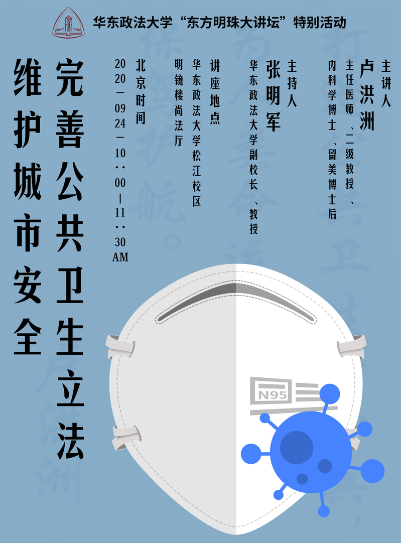 華東政法大學“東方明珠大講壇”特別活動有幸請到了上海市(復旦大學附屬)公共衛生臨床中心黨委書記、復旦大學附屬華山醫院院長助理盧洪洲在線主講《完善公共衛生立法 維護城市安全》。盧洪洲教授是內科學博士生導師、護理學博士生導師、博士后流動站站長、公共衛生碩士生導師,以第一作者或通訊作者在國內外發表各類論文450余篇,其中在SCI引用雜志包括《Nature》《New England Journal of Medicine》發表論著140余篇;主編專業參考書12部。曾入選國家百千萬人才工程、“有突出貢獻中青年專家”、全國道德模范與身邊好人(中國好醫生)、“白求恩式好醫生”等,享受國務院特殊津貼。