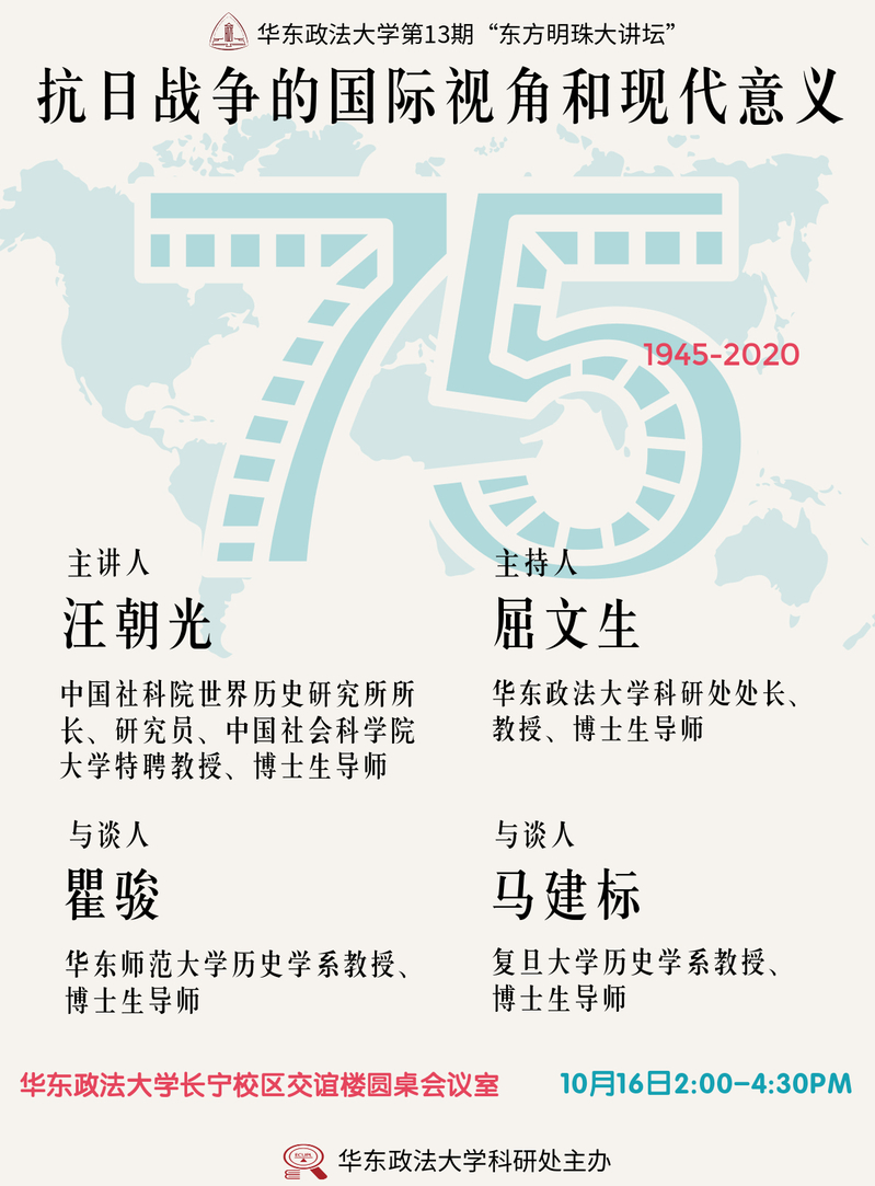 華東政法大學第13期“東方明珠大講壇”有幸邀請中國社會科學院世界歷史研究所所長、研究員,中國社會科學院大學特聘教授汪朝光主講《抗日戰爭的國際視角和現代意義》。汪朝光教授為國家社科基金學科評審組成員,博士生導師,日本京都大學客座教授,中國孫中山研究會會長,中國現代史學會副會長。主要論著有《1945-1949:國共政爭與中國命運》(2010)、《中華民國史》(第四、十一卷)(2011)、《和與戰的選擇:戰后國民黨的東北決策》(2016)、《中國抗日戰爭史》(第四卷)(2019)等。
