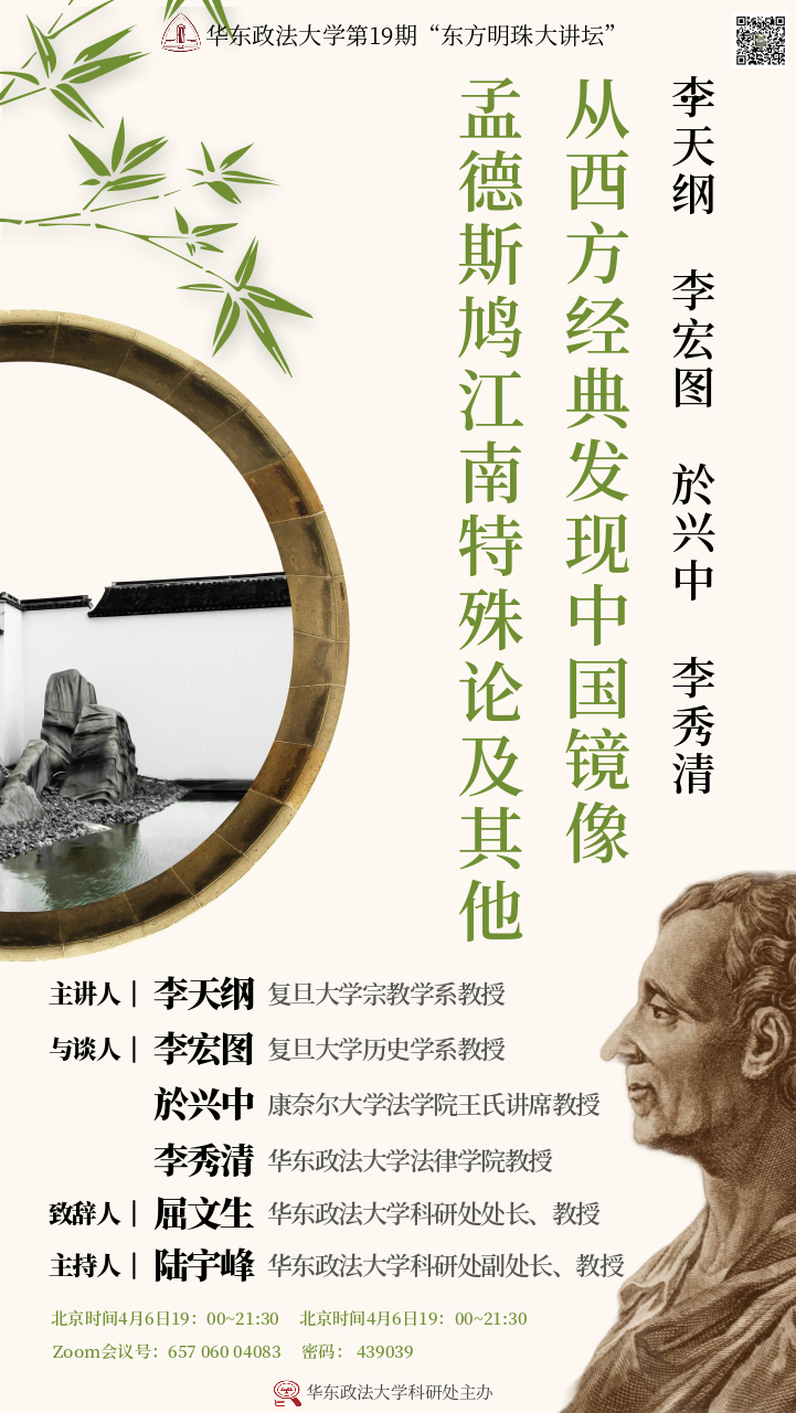 早期西方研讀中國,大致遵循三條路徑:觀禮儀,譯儒典,是為伏爾泰氏等文化仰慕流派之淵藪;探貿易,察食貨,則啟亞當·斯密社會經濟分析之脈絡;而孟德斯鳩另辟蹊徑,置中國于普世性政體理論之中,考地理,原政制,更新西方傳統古典政體之說。本期大講壇有幸邀請到復旦大學宗教學系李天綱教授,以孟德斯鳩江南特殊論為切入點,梳理中國鏡像構成及其對于歐洲思想的貢獻。復旦大學歷史學系李宏圖教授長期研究啟蒙運動與歐洲近代思想史,他將闡釋十八世紀啟蒙運動中中國的影響,與李天綱教授展開對話。同樣榮幸的是,本期大講壇也邀請到知名法理學家、康奈爾大學法學院王氏講席教授於興中,以及知名法律史學家、華東政法大學法律學院教授李秀清與談。我校科研處處長屈文生教授等專家學者將參加本次大講壇,講座由科研處副處長陸宇峰教授主持。