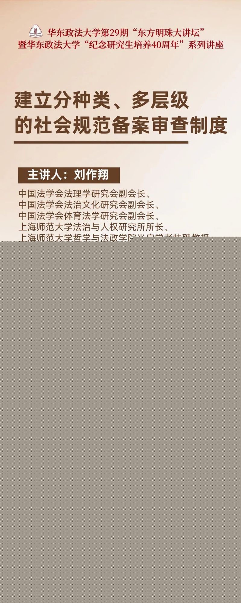有鑒于此,華東政法大學第29期“東方明珠大講壇”有幸邀請到中國法學會法理學研究會副會長、上海師范大學哲學與法政學院光啟學者特聘教授劉作翔主講“建立分種類、多層級的社會規范備案審查制度”。劉教授從理論和實踐兩個層面闡釋將社會規范納入備案和審查范圍的必要性,指出該制度在發揮社會規范在協調社會關系、約束社會行為、維護社會秩序等積極作用的同時,也能夠防止社會規范偏離正軌而產生的負面作用,進而實現國家和社會生活的法治化。