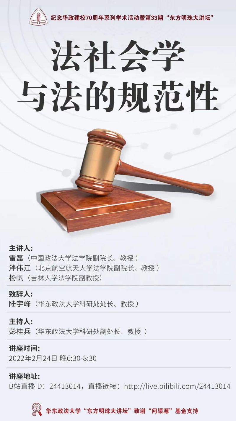 有鑒于此,華東政法大學第33期“東方明珠大講壇”邀請中國政法大學法學院副院長雷磊教授、北京航空航天大學法學院副院長泮偉江教授、吉林大學法學院楊帆副教授聯袂主講《法社會學與法的規范性》。我校科研處處長陸宇峰教授等專家學者將參加本次大講壇,大講壇由科研處副處長彭桂兵教授主持。