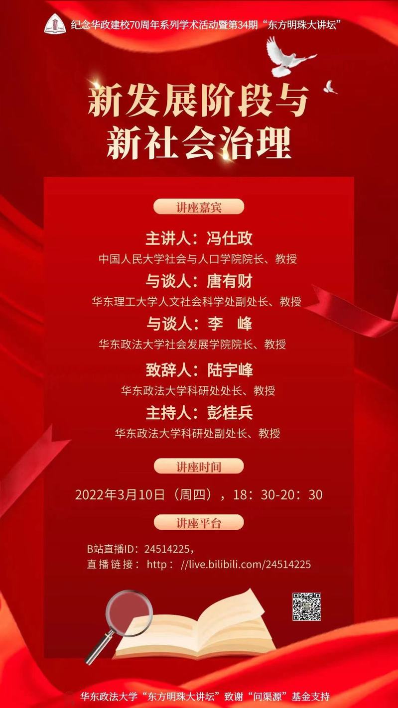 有鑒于此,華東政法大學第34期“東方明珠大講壇”有幸邀請中國人民大學社會與人口學院院長馮仕政教授主講“新發展階段與新社會治理”。馮仕政教授任教育部社會學教指委秘書長,全國社會工作專業學位研究生教指委副主任委員,北京市社會學會副會長。主要從事政治社會學、組織社會學、歷史社會學、社會不平等等領域的研究。在《社會學研究》等國內外重要專業期刊上發表論文數十篇,有《當代中國的社會治理與政治秩序》、《西方社會運動理論研究》、《社會治理新藍圖》等專著出版。多次主持國家社科基金等各級各類課題。曾獲北京市哲學社會科學優秀成果一等獎、北京市高等學校教學名師獎、霍英東教育基金高等院校青年教師獎(研究類)、寶鋼優秀教師獎、北京市高等教育優秀教學成果獎、高等教育國家級教學成果獎、教育部第八屆人文社會科學優秀成果三等獎等表彰。入選教育部“新世紀優秀人才”支持計劃,以及北京市新世紀社科理論人才“百人工程”和“四個一批”理論人才培養工程。