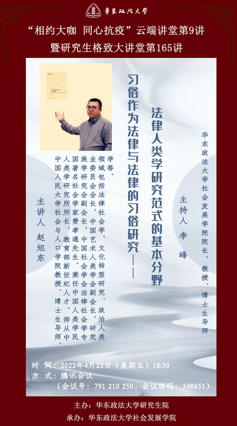 主講人:趙旭東,中國人民大學社會與人口學院教授、博士生導師,人類學研究所所長,教育部新世紀人才,師從中國著名社會學家費孝通先生。兼任中國人類學民族學研究會副會長,中國社會學會法律社會學專業委員會會長,中國藝術人類學會副會長。