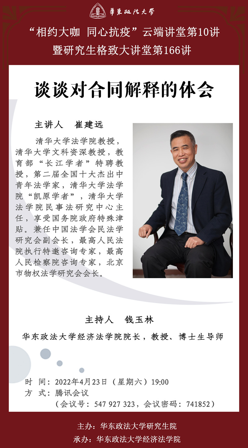 主講人:崔建遠,清華大學法學院教授,清華大學文科資深教授,教育部“長江學者”特聘教授,第二屆全國十大杰出中青年法學家,清華大學法學院“凱原學者”,清華大學法學院民事法研究中心主任,享受國務院政府特殊津貼。兼任中國法學會民法學研究會副會長,最高人民法院執行特邀咨詢專家,最高人民檢察院咨詢專家,北京市物權法學研究會會長。